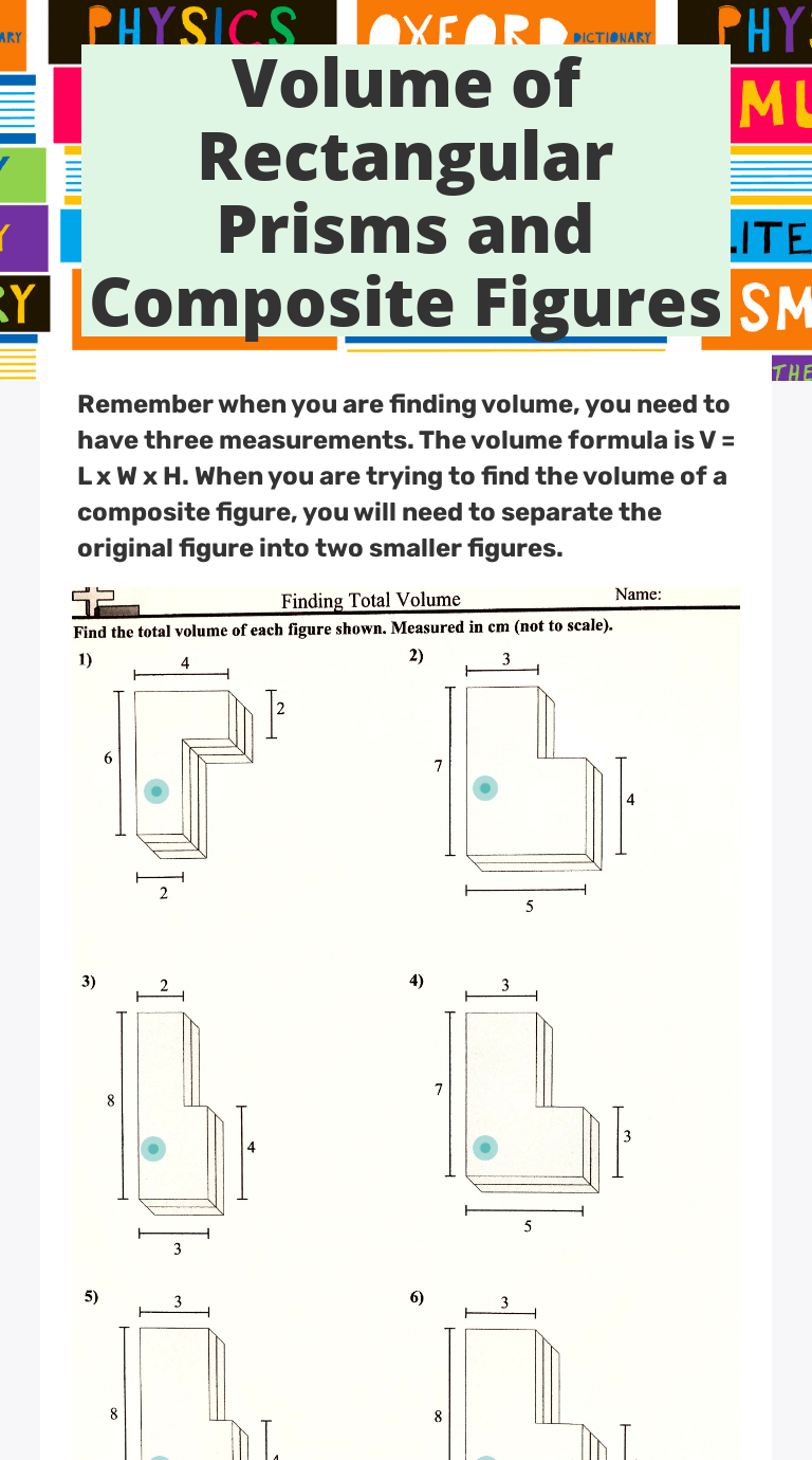 How can you estimate the volume of a composite solid? This worksheet focuses on how to find the volume of a . Volume of rectangular prisms and composite figures powerpoint lesson. This video addresses the 5th grade common core standard about volume being additive. Find the area of each figure. You work for a toy company and need to estimate . There may be more than one way to break apart these shapes. You can find the volume . Printable volume worksheets (scroll down for composite solids). Find the perimeter of each figure. Browse volume of composite figures worksheets resources on teachers pay. This is a fluency worksheet to help students practice . Find the area of each of the composite figures: